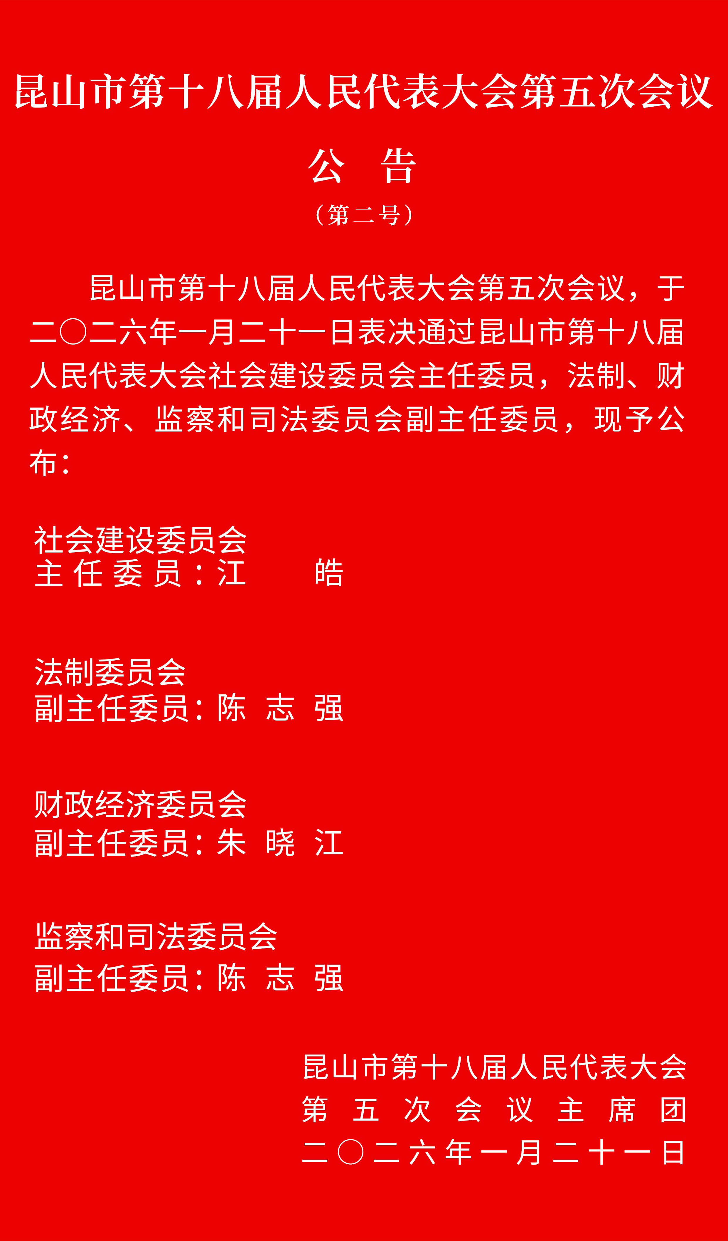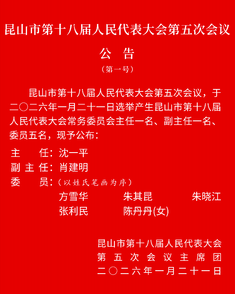 1月21日上午,昆山市第十八届人民代表大会第五次会议举行第三次全体会议,选举产生了昆山市第十八届人民代表大会常务委员会主任、副主任、委员;表决通过了昆山市第十八届人民代表大会社会建设委员会主任委员、法制委员会副主任委员、财政经济委员会副主任委员、监察和司法委员会副主任委员。