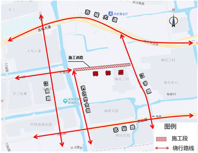 为最大限度降低施工对交通的影响,同步保障施工安全和交通安全,经公安交管部门会同姑苏区住建部门及施工方等单位充分研究,对平河路(广济北路-江坤路)、梅林路(齐门外大街-江宇路)采取下述临时管理措施: