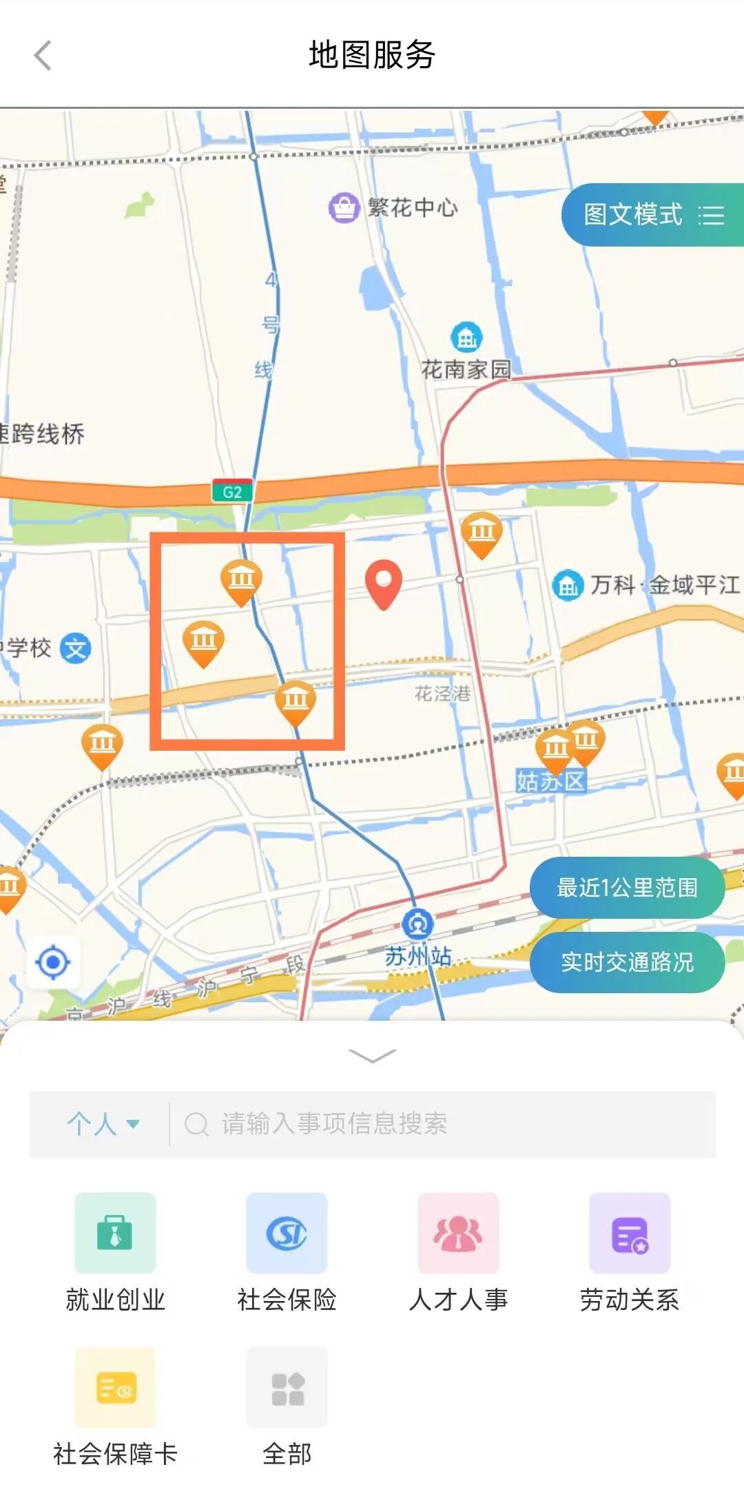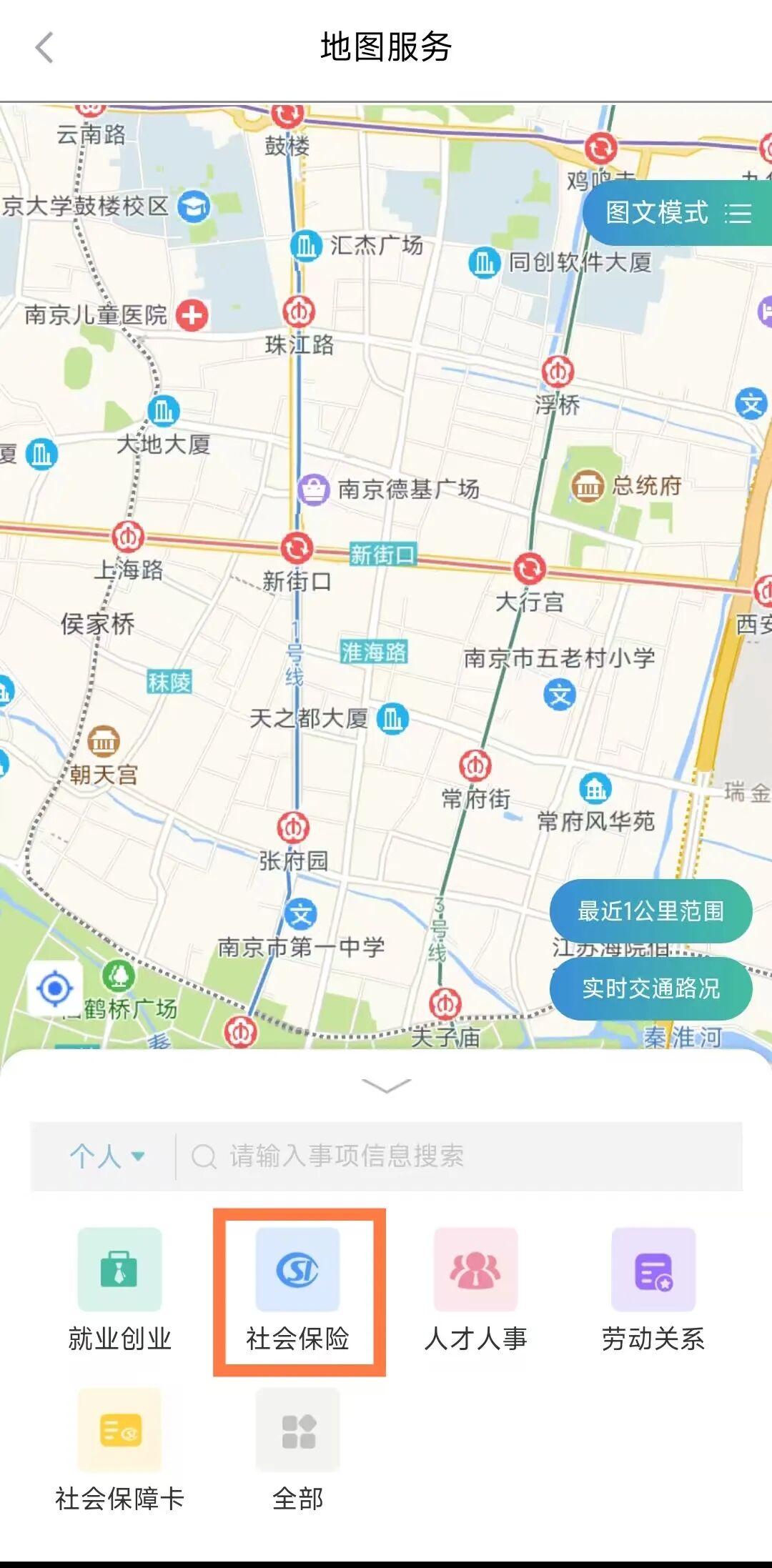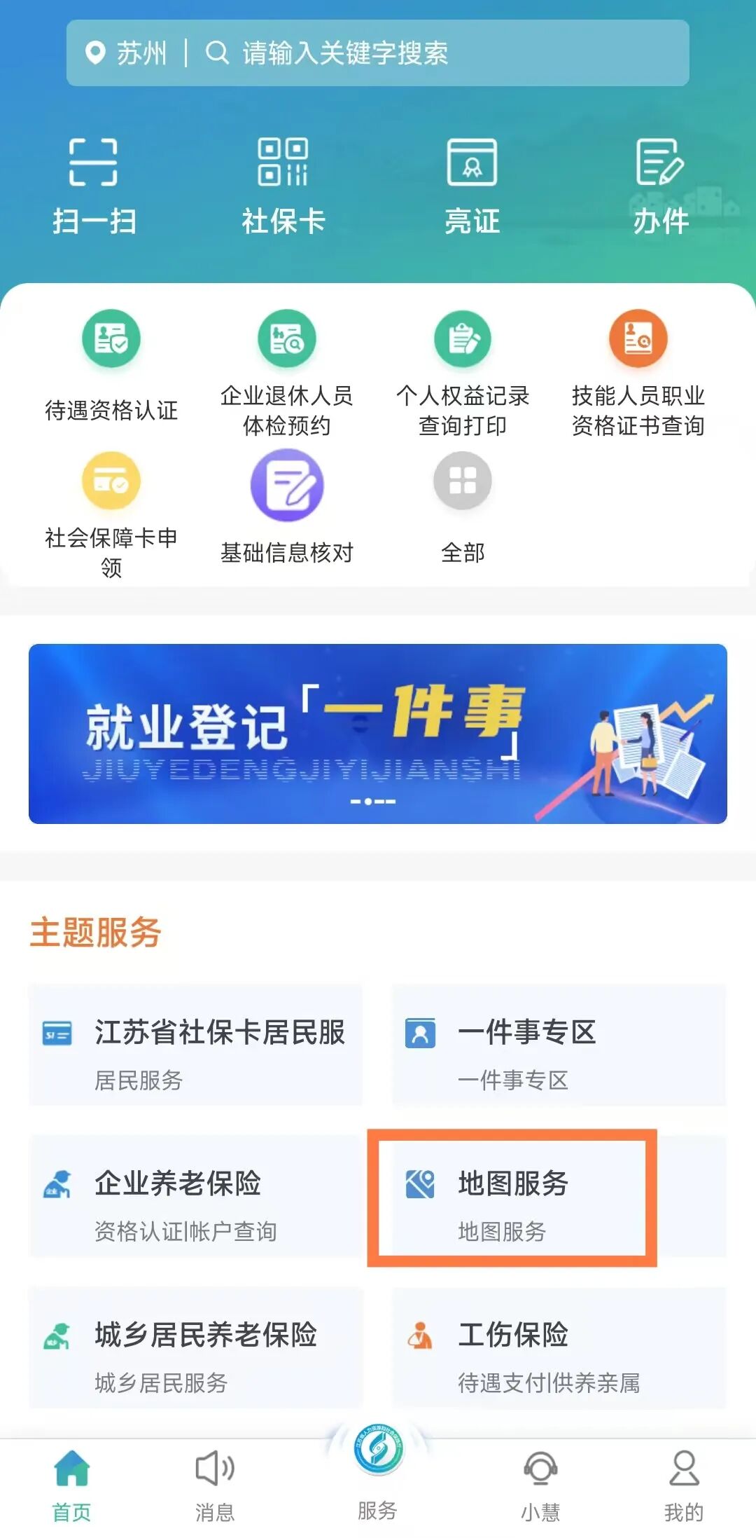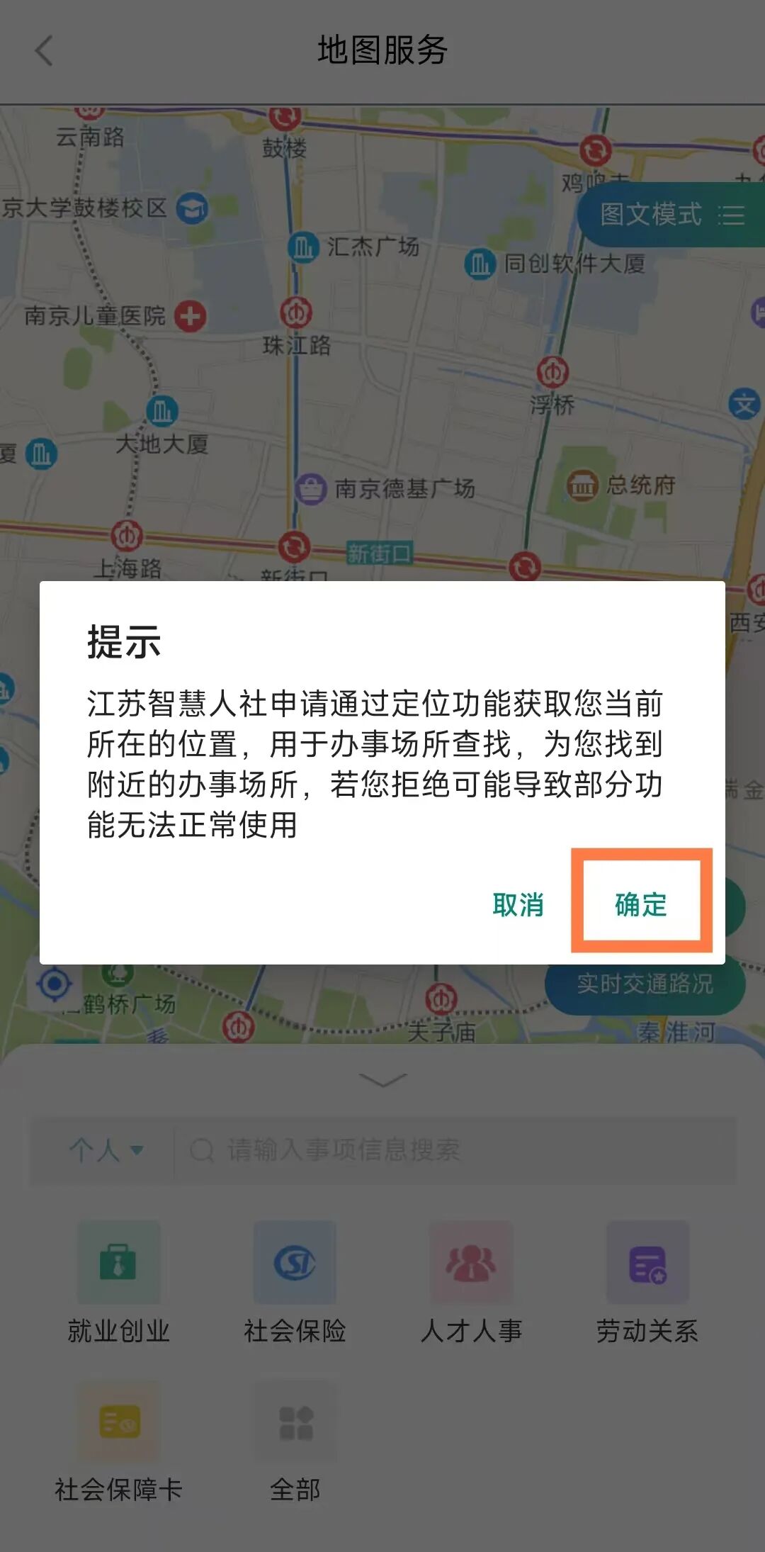 下载“江苏智慧人社”APP,完成注册登录。点击首页“地图服务”,进入地图,点击“确定”,同意使用定位功能获取位置。