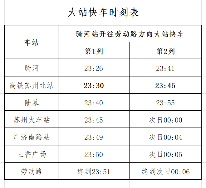 该大站快车沿途停靠骑河站、高铁苏州北站、陆慕站、苏州火车站、广济南路站、三香广场站、劳动路站共7站,其具体时刻表如下:
