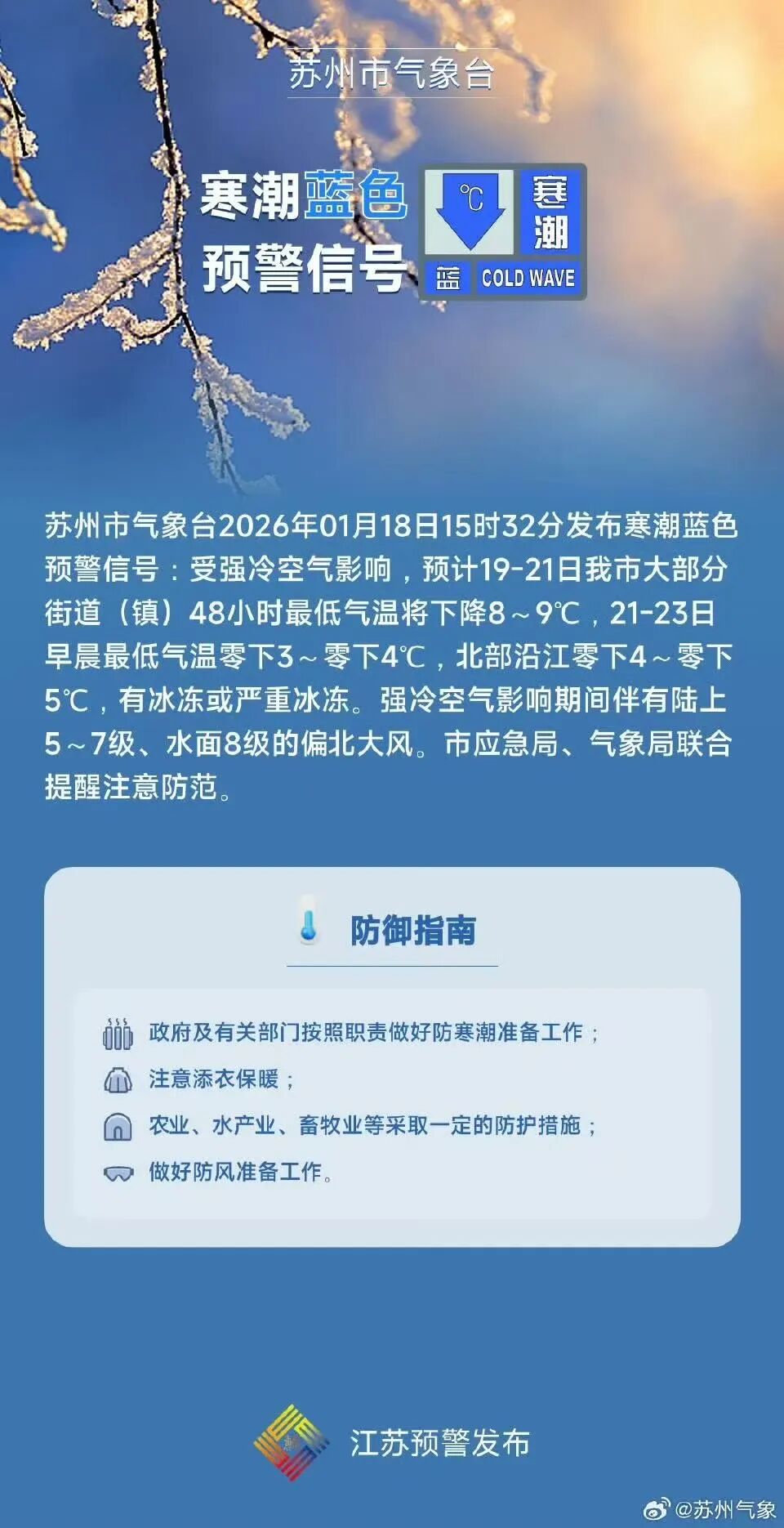 苏州市气象台2026年01月18日15时32分发布寒潮蓝色预警信号。