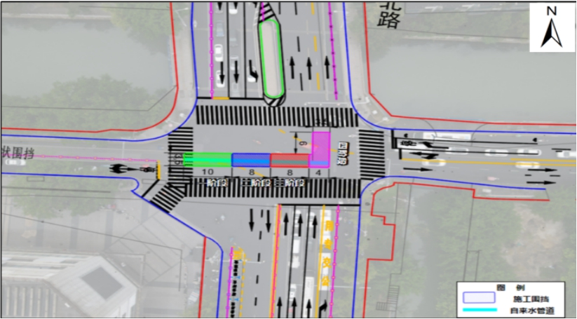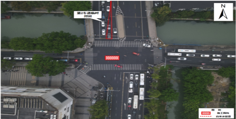 施工期间,北进口第2车道临时封闭,直行车辆汇入右侧第3车道行驶,其他方向的机动车、非机动车、行人正常通行。