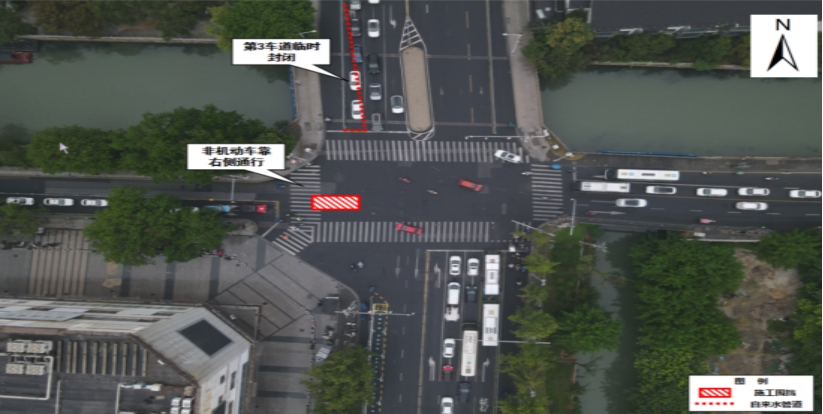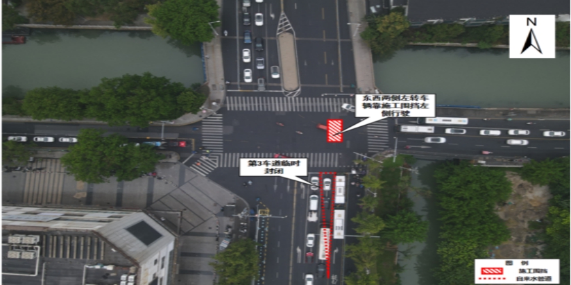 施工期间,北进口第3车道临时封闭,直行车辆汇入第2车道行驶,其他方向的机动车、非机动车、行人正常通行。