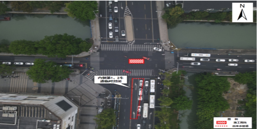 施工期间,南进口内侧第1、第2车道临时封闭,直行车辆汇入右侧第3车道行驶,其他方向的机动车、非机动车、行人正常通行。