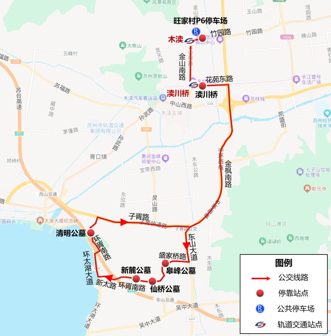 旺家村P6停车场(1号线“木渎”站),渎川桥(5号线“渎川桥”站),皋峰公墓,仙桥公墓,新麓公墓,清明公墓
