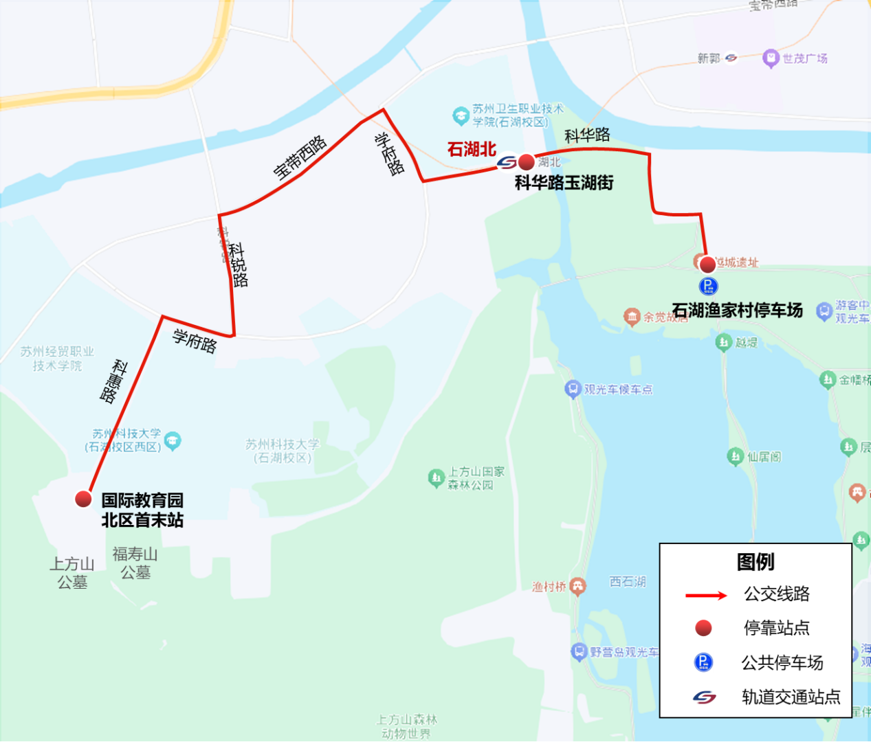 “石湖渔家村”停车场,科华路玉湖街(3号线“石湖北”站),国际教育园北区首末站(上方山公墓、福寿山公墓)
