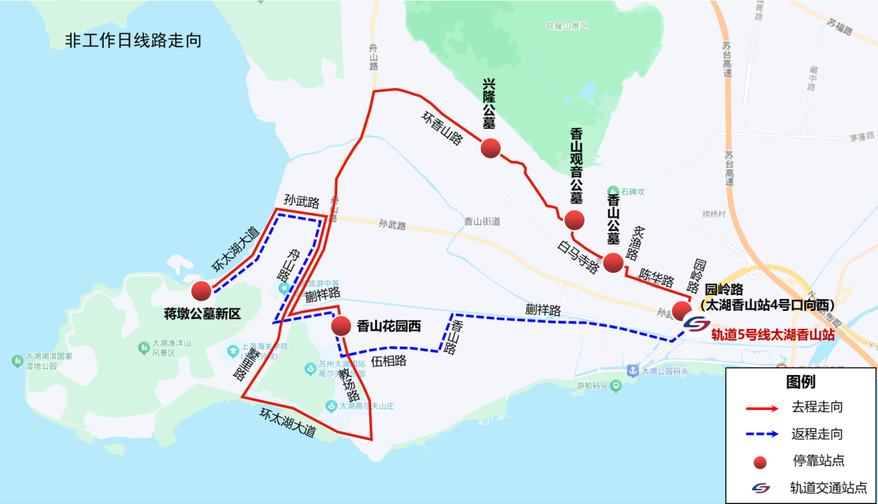 地铁5号线“太湖香山”站4号口出向西步行约100米→园岭路→扫墓接驳专线直达香山墓区、观音墓区、兴隆墓区和蒋墩新老墓区(祭扫结束后乘专线原路返回)