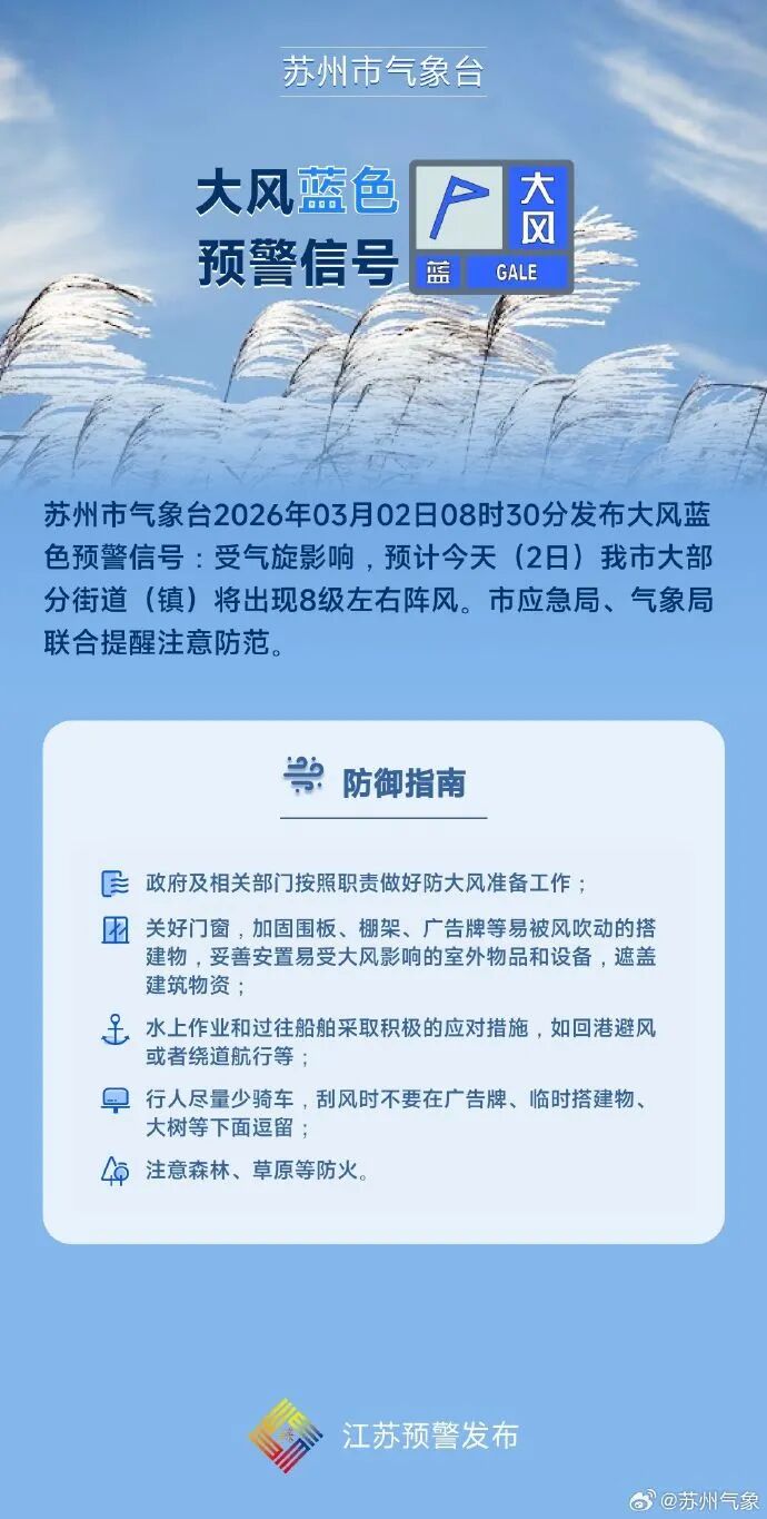 苏州市气象台3月2日8时30分发布大风蓝色预警信号,受气旋影响,预计今天我市大部分街道(镇)将出现8级左右阵风,市应急局、气象局联合提醒注意防范。