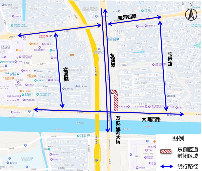 施工期间,需要通过匝道在友新路和太湖西路转换的车辆和行人,建议从友新路、宝带西路、宴宫路、太湖西路、宝运路等周边道路绕行。