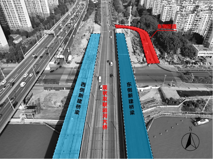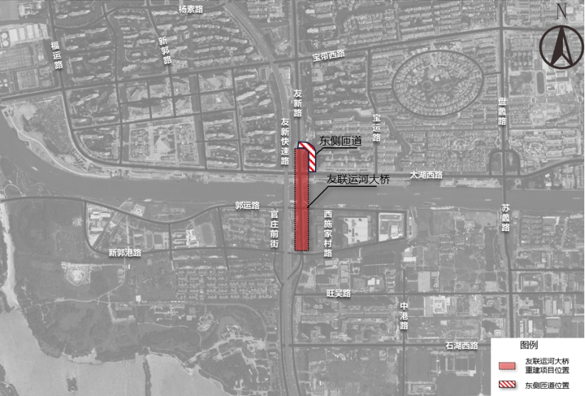 友联运河大桥拆除重建工程项目北起宝带西路、南至新郭港路,横跨京杭大运河,路线全长约915米。目前友联运河大桥结构状况等级被评定为E级,需拆除重建,建成后拓宽为双向六车道,将有效缓解周边交通压力。由于新建桥梁与现状路面存在高差,桥头抬高后纵坡已不满足非机动车与行人通行条件,需对连接太湖西路与友新路的东侧匝道进行整体改造施工。