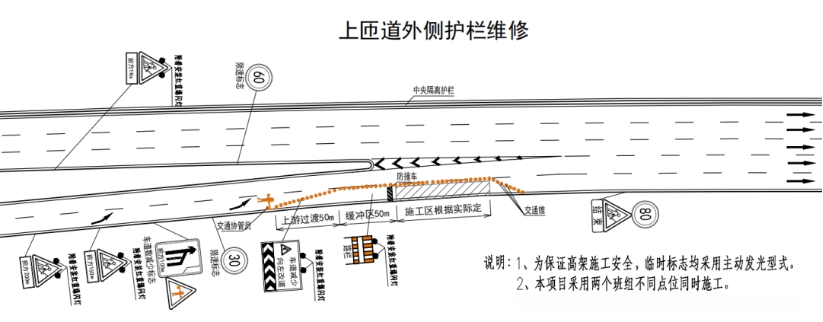 养护作业均在交通流量较小的时段进行,作业期间需动态占用快速路双向各一条机动车道进行,施工路段过往车辆可从其余车道按交通标识指引减速通行。