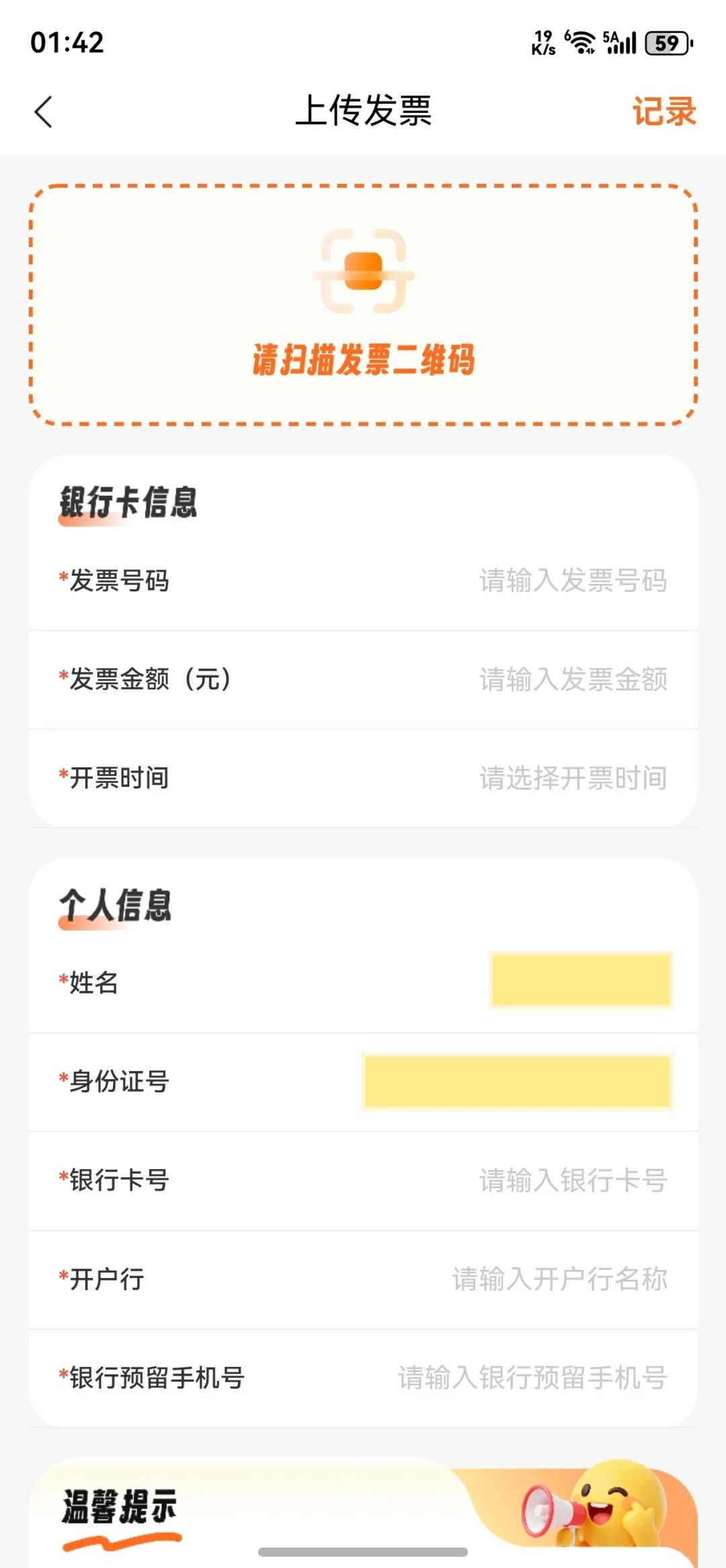 2.进入页面后,点击“上传发票”,依次填写银行卡信息和个人信息,确认无误后,提交参与抽奖;