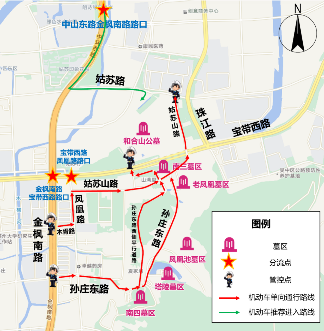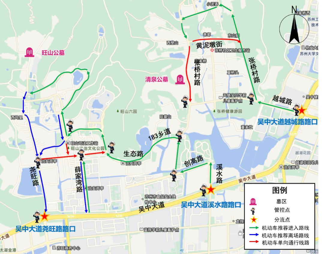自驾出行前,查看“江苏交警”“苏州交警”“苏州本地宝”发布的交通管制、绕行方案和出行提示。途经陵园、景区、城乡道路,服从现场指挥,规范停车,不违停、不占道、不占用应急车道,杜绝酒驾、超速、疲劳驾驶。