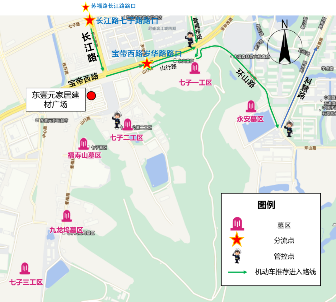 1)苏福快速路(长江路出口)-长江路-宝带西路-环山路(七子一工区、永安墓区);