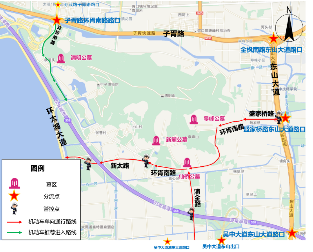 2)绕城高速(东山出口)-吴中大道-浦金路-环胥南路(仙桥公墓,新麓公墓)。