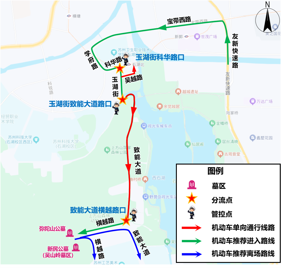 友新快速路(宝带西路出口)-宝带西路-学府路-科华路-玉湖街-致能大道-横越路(吴山岭墓区、弥陀山公墓)。