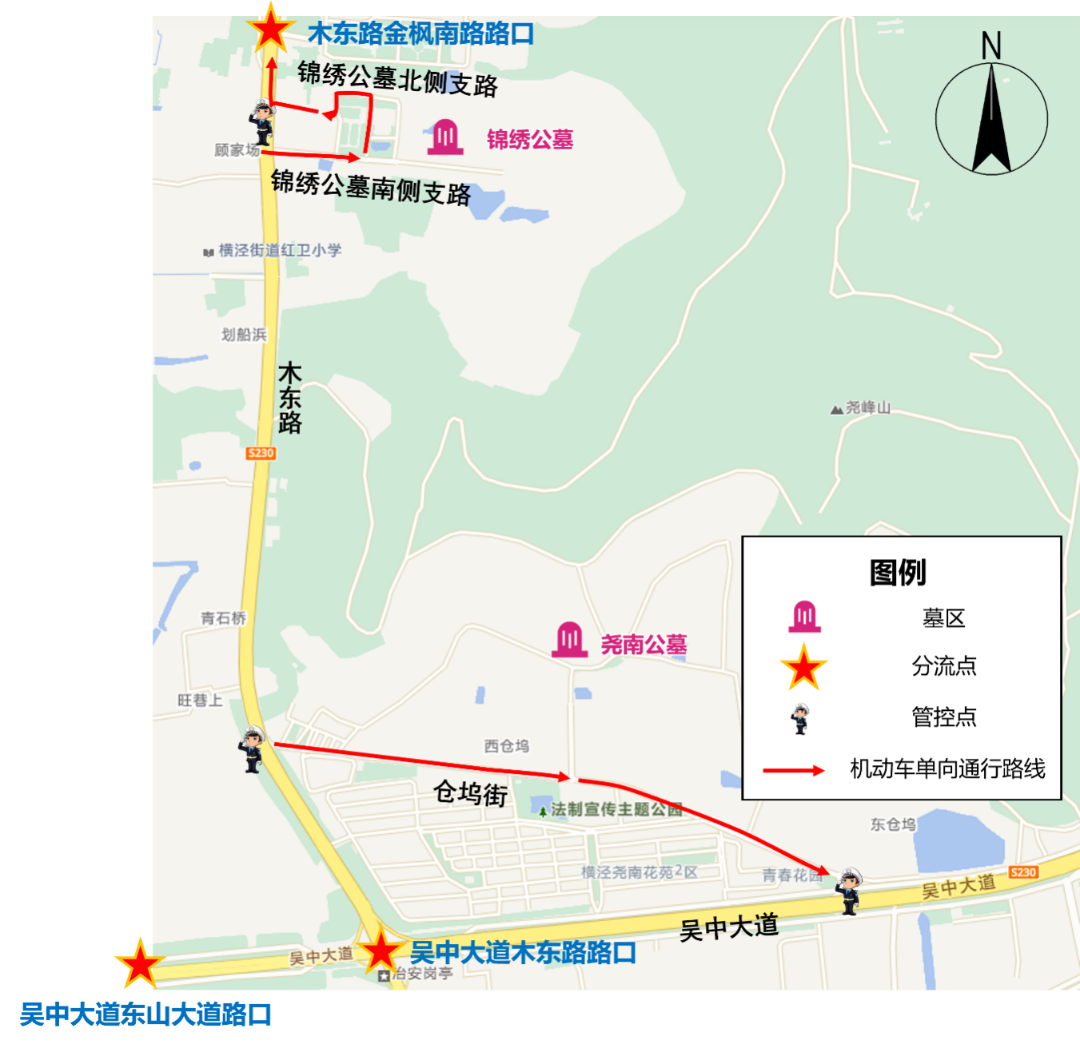 (3)锦绣公墓北侧支路由东往西单向通行。