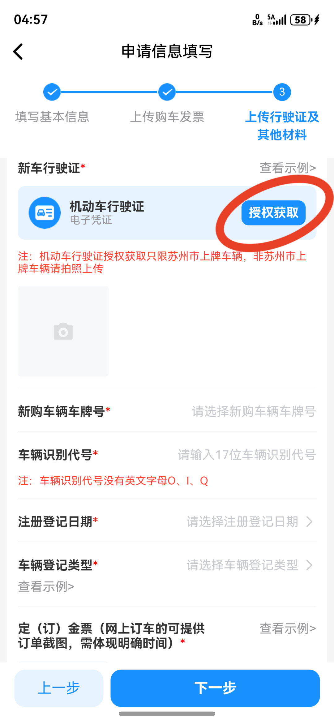 第五步在该页上传机动车行驶证(可获授权获取),填写新购车辆车票号、车辆识别代号、注册登记日期、车辆登记类型、定(订)金票截图等信息;