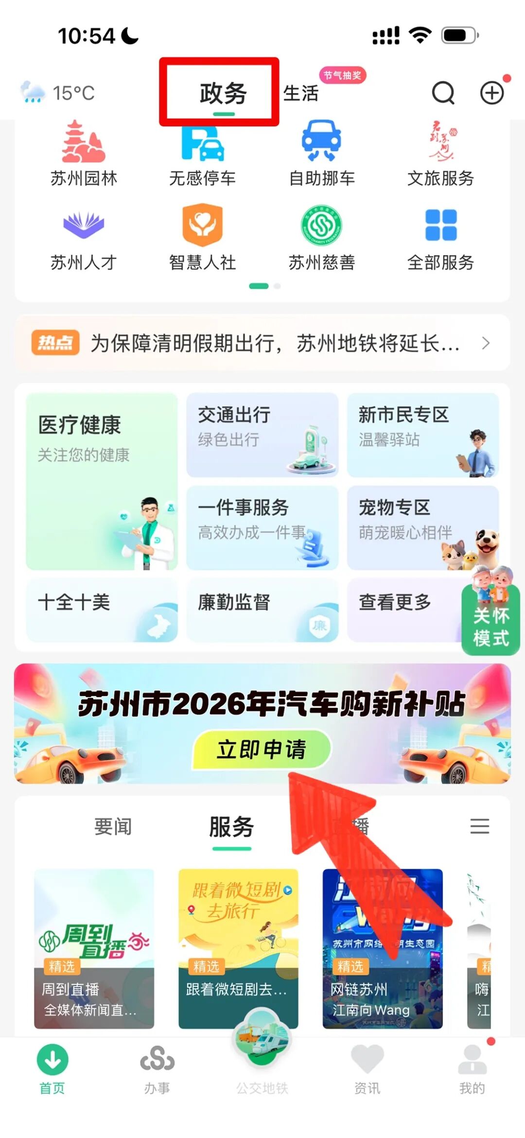 第一步打开苏周到APP,在政务页中间或者切换至生活页,找到“苏州市2026年汽车购新补贴”入口,点击进入活动页;