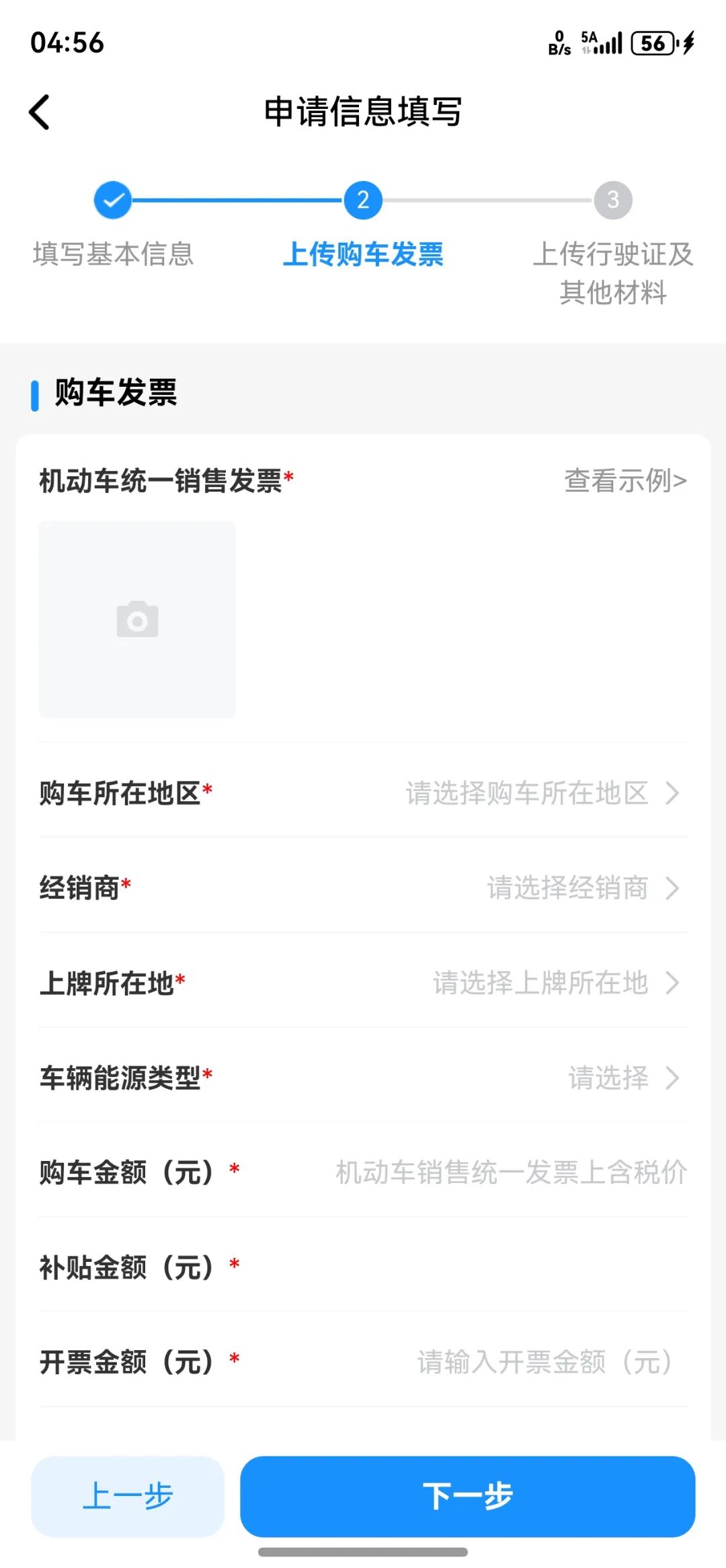 第四步在该页上传购车发票,并填写购车地、经销商、上牌所在地、车辆能源类型、购车金额等信息;