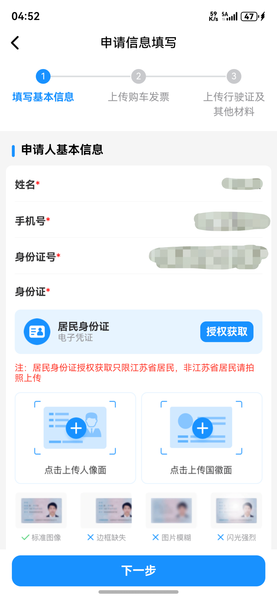 第三步该页仔细核对填写申请人的基本信息(也可授权获取身份信息),上传身份证正反面图像,填写紧急联系人电话(仅用于联系不上申请人时使用),选择领取补贴账户信息(中国建设银行数字人民币账户或者银行账户,需二选一);