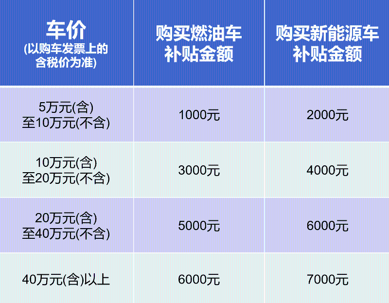 燃油车:燃油车购车价格(以机动车销售统一发票上含税价为准,下同)5万元(含)-10万元(不含)的,购车并审核通过后给予1000元补贴;10万元(含)-20万元(不含)的,购车并审核通过后给予3000元补贴;20万元(含)-40万元(不含)的,购车并审核通过后给予5000元补贴;购车价格40万元(含)以上的,购车并审核通过后给予6000元补贴。