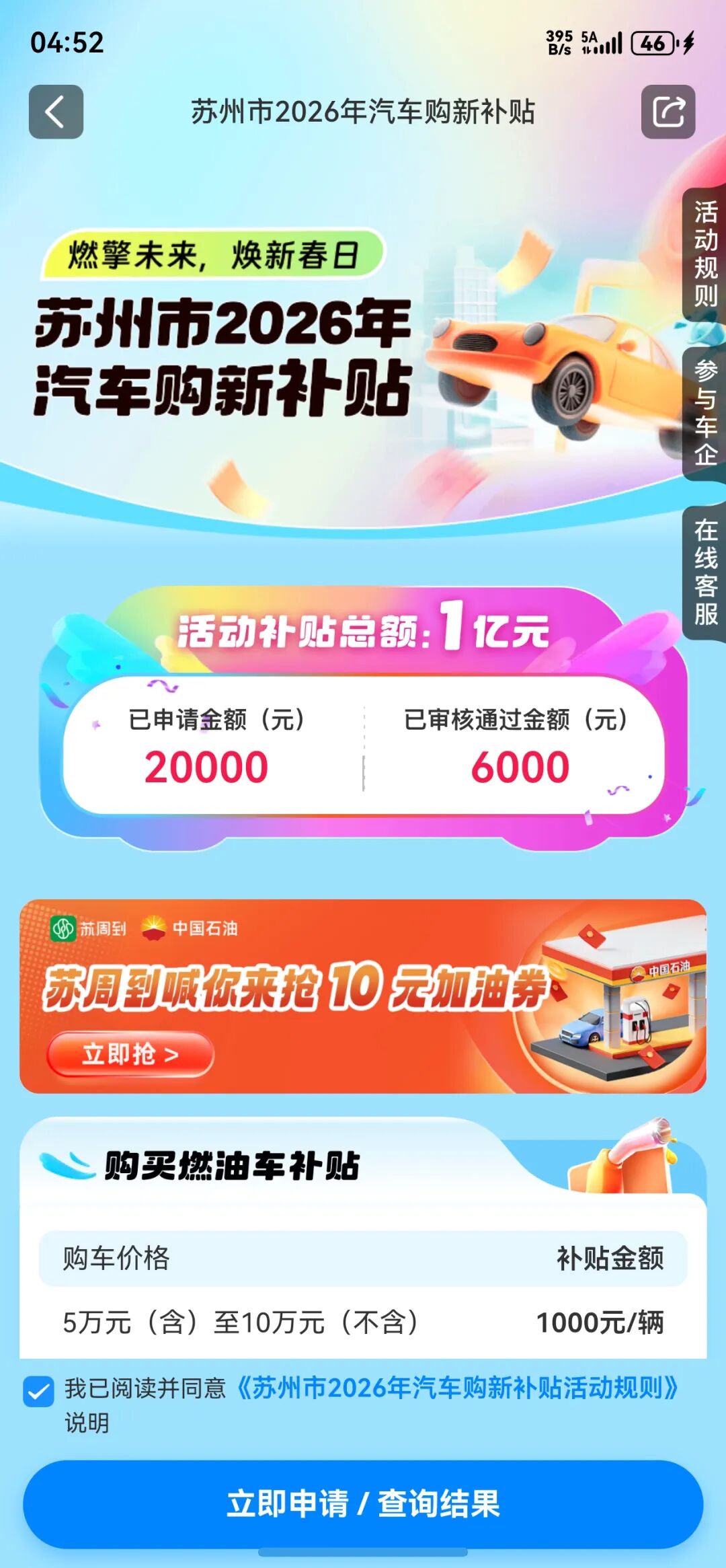 第二步进入活动页后,在页面底部,点击《苏州市2026年汽车购新补贴活动规则》后仔细查阅,勾选“我已阅读并同意”,点击页面底部“立即申请/查询结果”按钮,进入申领页面;