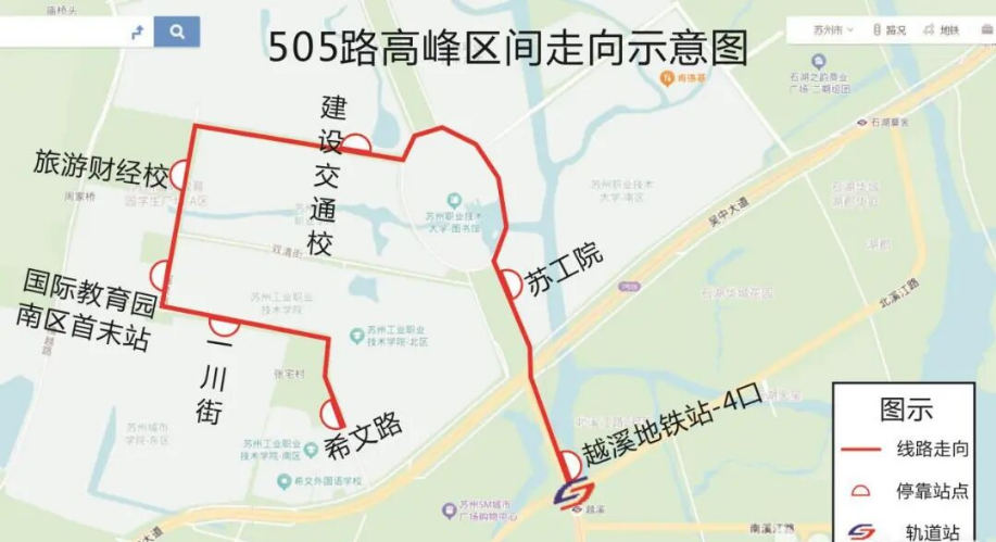 新开通的505路高峰区间车,线路全长不到5公里。线路走向途经塔韵路、致能大道、旅思街、瑶泉路、一川街、希文路,沿途停靠地铁越溪站4号口、苏工院、建设交通校、旅游财经校、国际教育园南区首末站、一川街、希文路等站点。