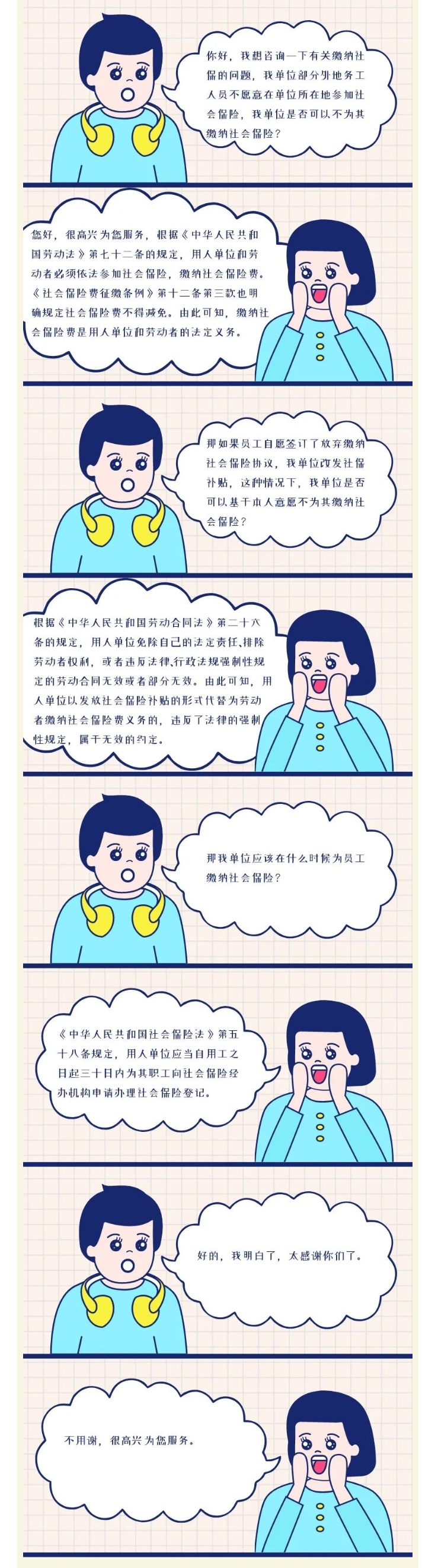 《中华人民共和国劳动法》第七十二条社会保险基金按照保险类型确定资金来源,逐步实行社会统筹。用人单位和劳动者必须依法参加社会保险,缴纳社会保险费。