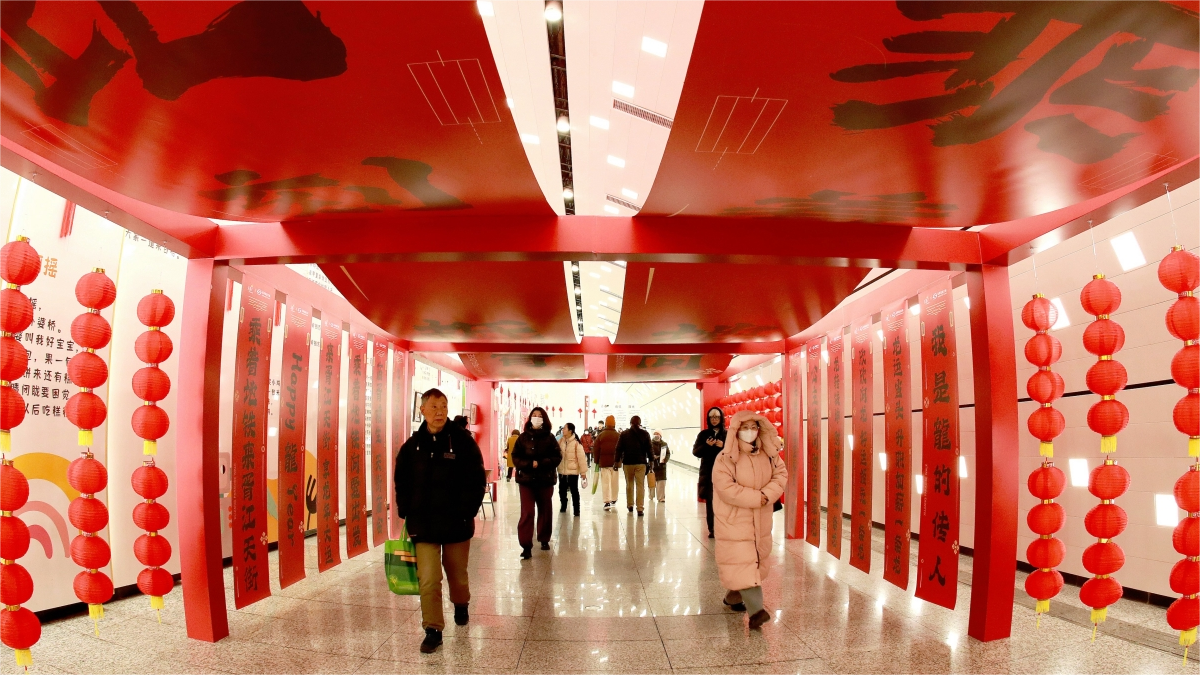 走进苏州轨道交通劳动路站换乘通道,满满的年味扑面而来。通道两侧搭建了挂满灯笼和儿童字画的红色桁架,许多过路的乘客停下脚步拍照留影,成为新年新晋打卡地。
