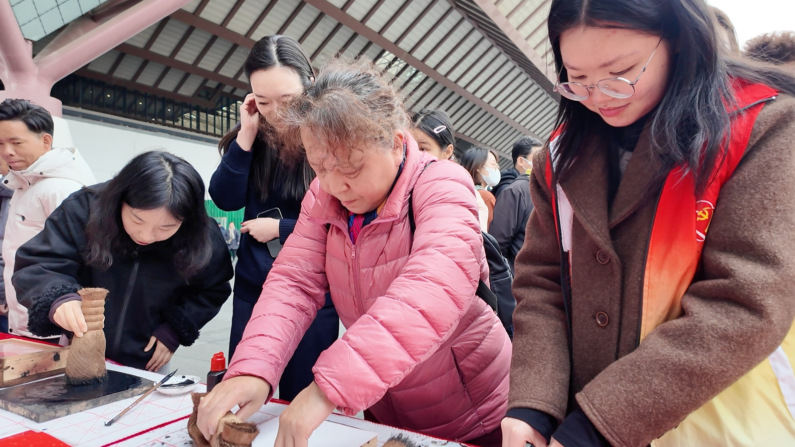 临近春节,苏州火车站北广场一片熙熙攘攘的热闹景象,一场传统民俗体验活动让苏州站往来的人们感受到浓浓年味,图为木版年画体验摊位吸引众多旅客驻足参与。
