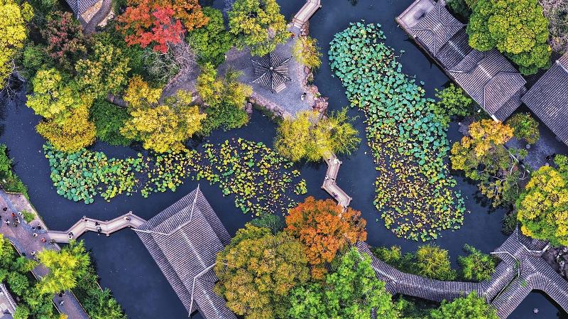 昨天(11月3日),航拍镜头里的苏州古典园林拙政园五彩斑斓,宛如一幅彩色画卷,吸引了众多市民、游客入园游览。