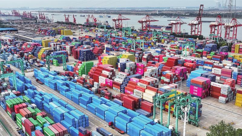 冲刺四季度、发力“全年红”。临近年末,苏州港区抢时间、争速度、创效益,进出港装卸作业呈现一派繁忙景象。图为昨天(12月2日),张家港永嘉集装箱码头货轮在装卸集装箱作业。
