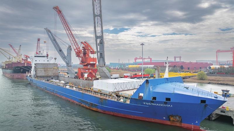 昨天(3月27日),张家港港新重装码头作业繁忙,总货值近4亿元的储能柜、工程车辆等电力设备正有序装船。这批货物今天发往阿曼,用于当地大型电力工程建设。