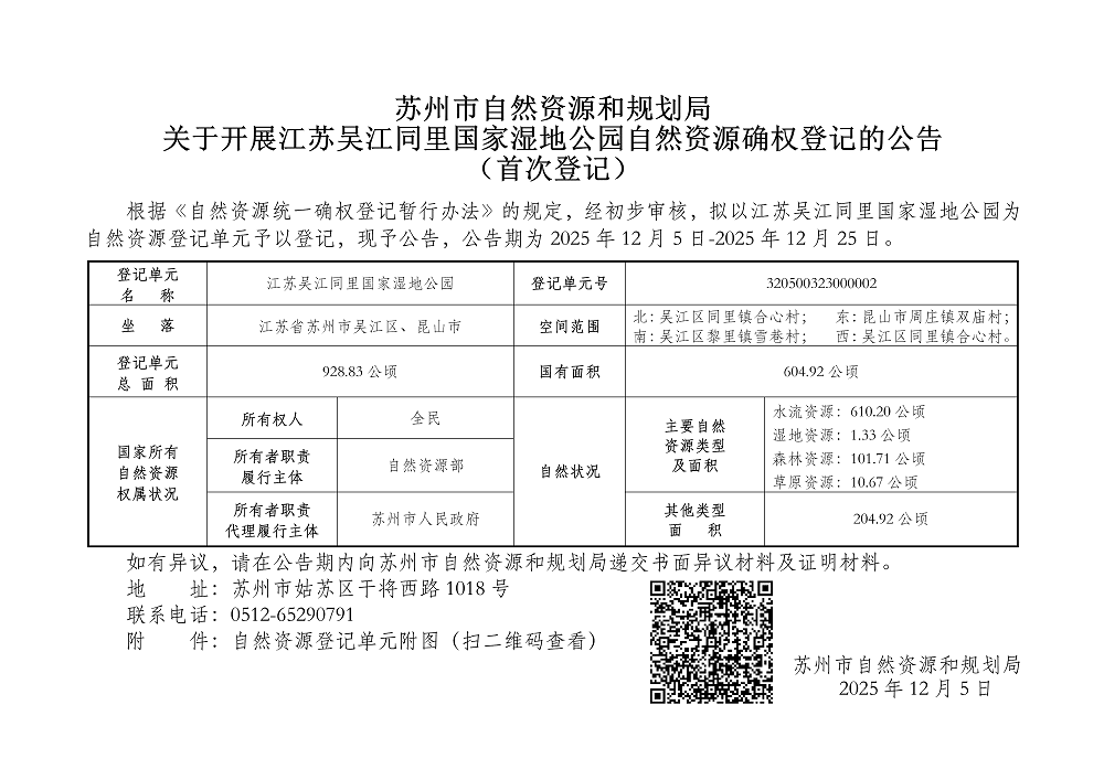 苏州市自然资源和规划局关于开展江苏吴江同里国家湿地公园自然资源确权登记的公告(首次登记)