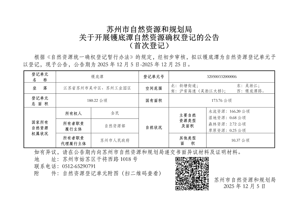 苏州市自然资源和规划局关于开展镬底潭自然资源确权登记的公告(首次登记)